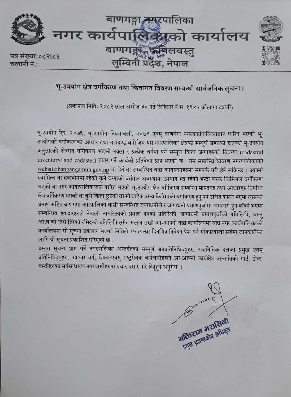 Home » भू-उपयोग क्षेत्र वर्गिकरण तथा कित्तागत विवरण सम्बन्धी सार्वजनिक सूचना ( वडा नं १ र वडा नं २ संग सम्बन्धीत)