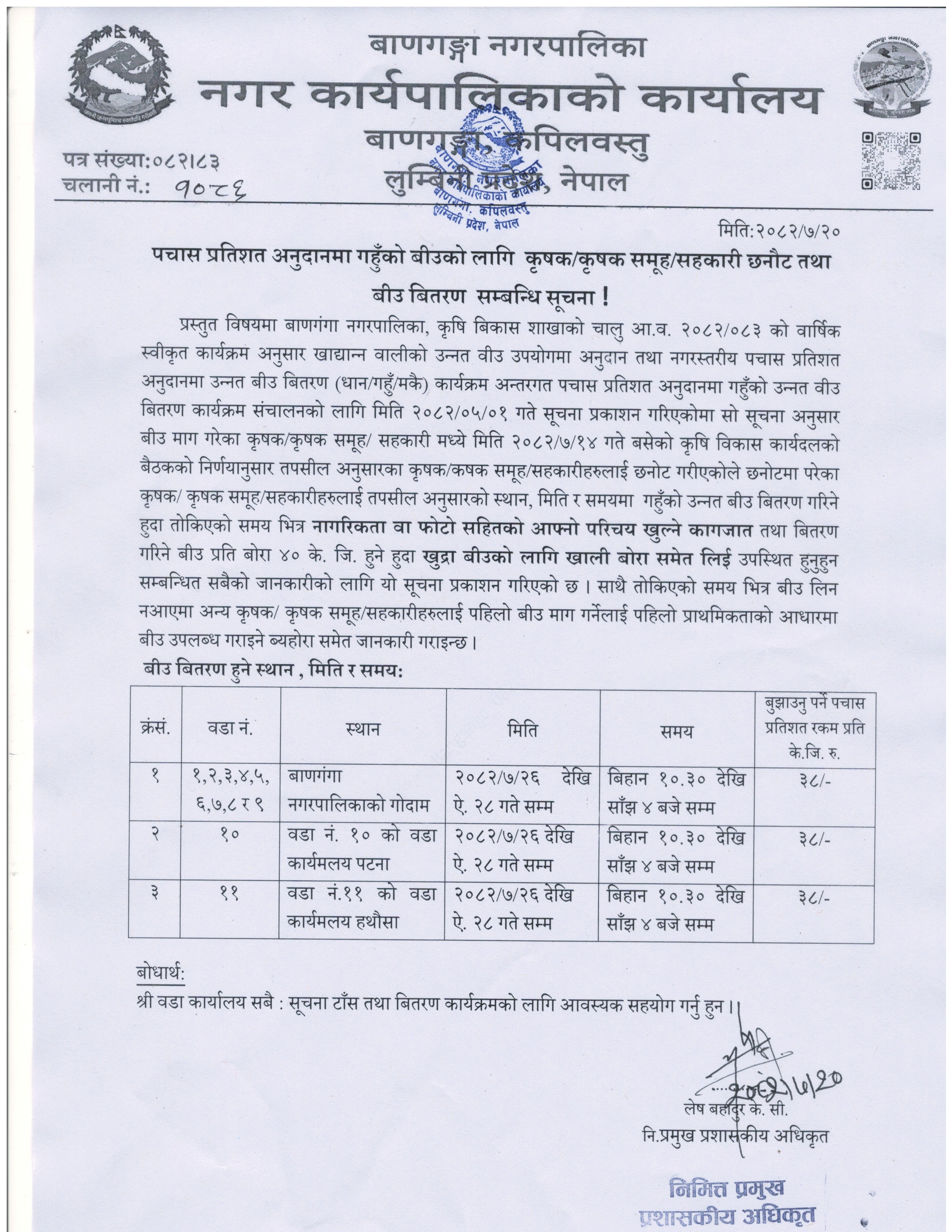 पचास प्रतिशत अनुदानमा गहुँको बीउको वितरण सम्बन्धी सूचना