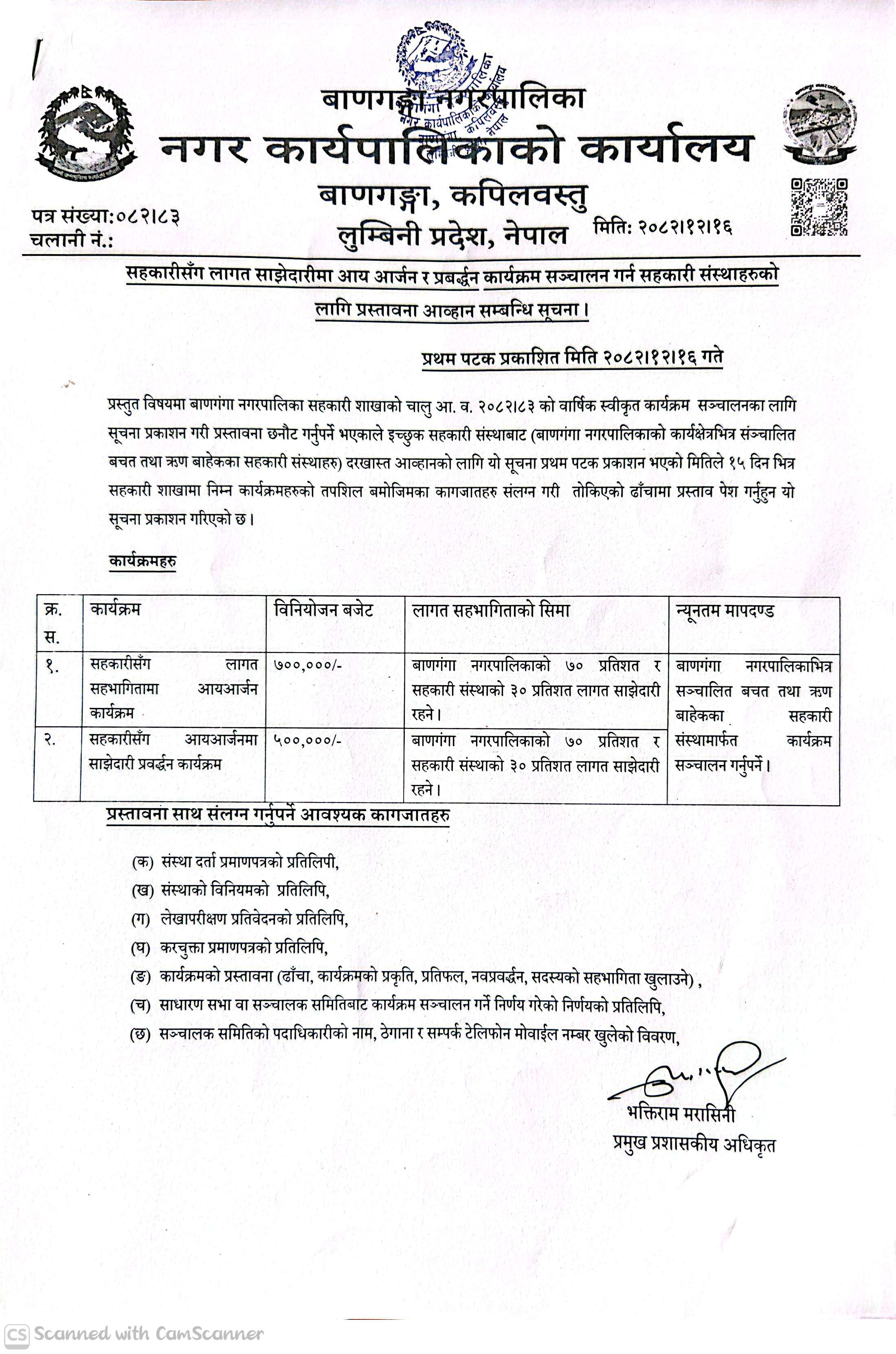 सहकारीसँग लागत साझेदारीमा आय आर्जन र प्रवर्द्धन कार्यक्रम सञ्चालन गर्न सहकारी संस्थाहरुको लागि प्रस्तावना आव्हान सम्बन्धी सूचना ।